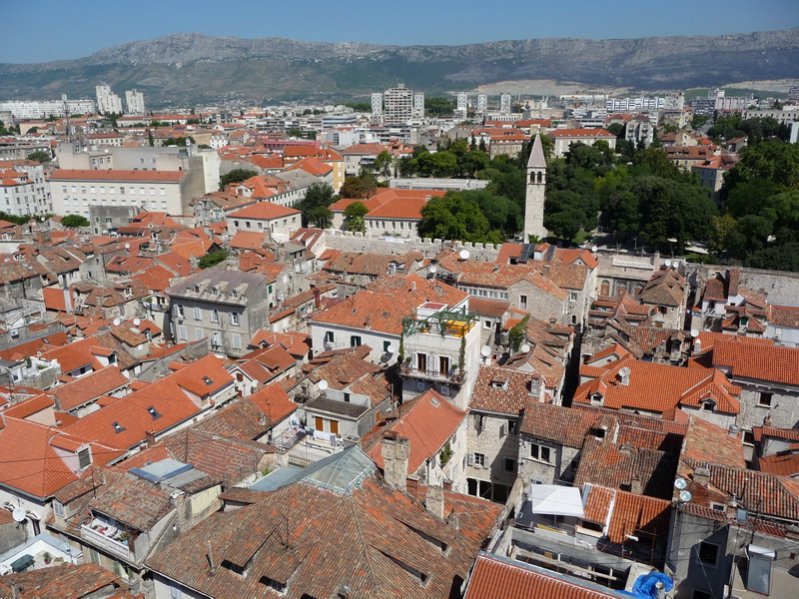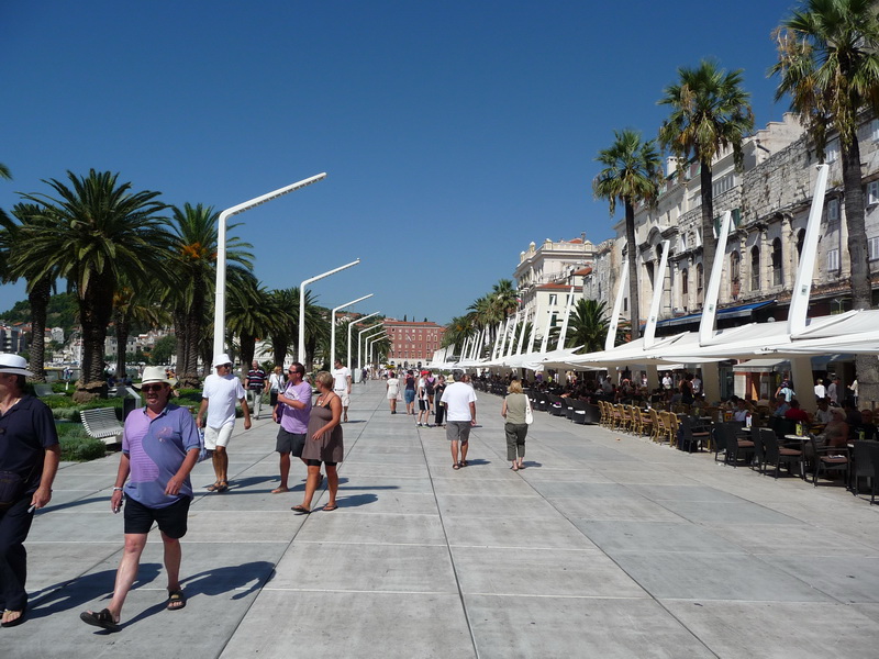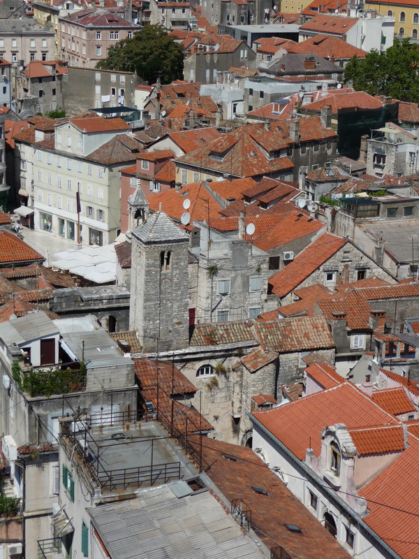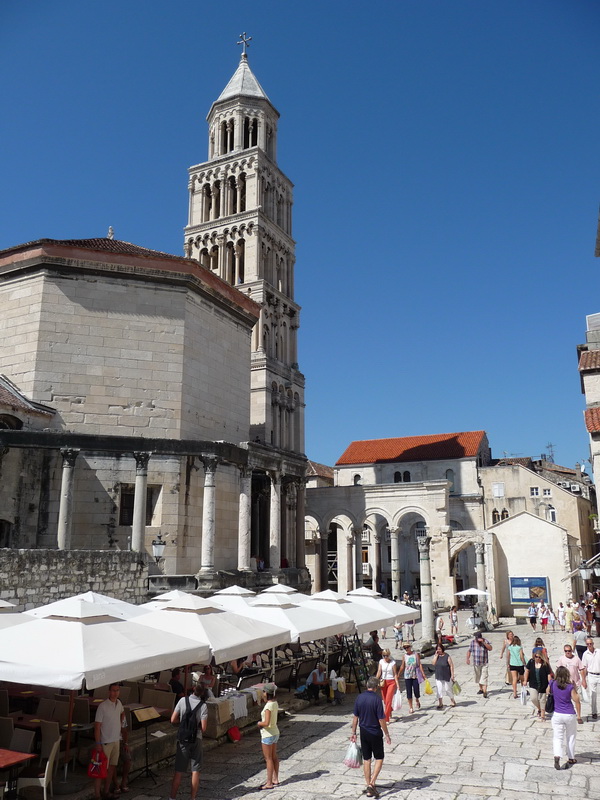 A partra leérve aztán megcsodáltuk a Riva pálmafáit és a palotát a másik oldalról, végül pedig rátértünk a lényegre és rögtön a Szent Dujmo-székesegyház tornyában találtuk magunkat. Körbefényképeztük a várost, majd folytattuk a Diocletianus-palota felderítését. Őszintén szólva egy jó óra alatt be is jártunk mindent, beleértve az alagsort is. Mivel hatalmas hőség volt és a fehér kövek is visszaverték a fényt, így viszonylag hamar meguntuk Split felderítését.
