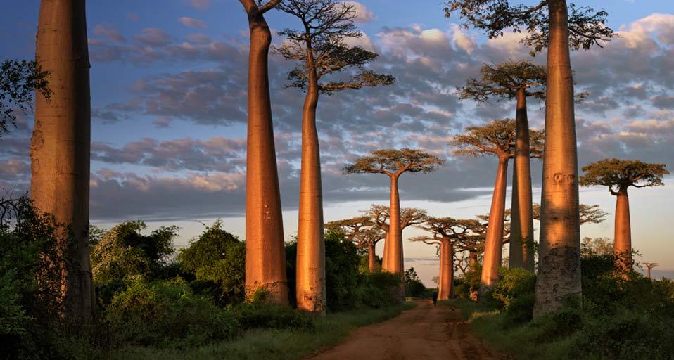 Madagaszkár egyik leghíresebb nevezetessége a majomkenyérfa. Ez a lélegzetelállító fénykép a Majomkenyérfa sugárúton készült. (Avenue of the Baobabs)