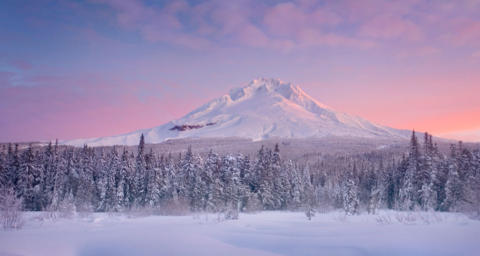 Csodás fényekben pompázó Mount Hood havazás után. - Oregon